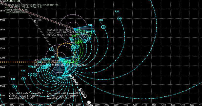 - Система моделирования автоматически рассчитывает траекторию виртуального аппарата таким образом, чтобы в заданный момент времени возникло критическое сближение с реальным дроном.